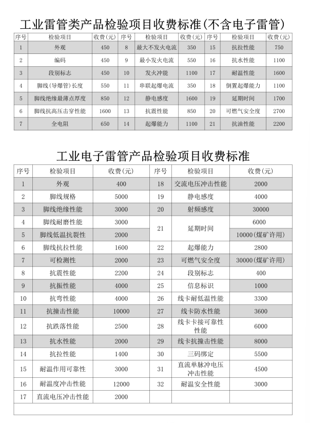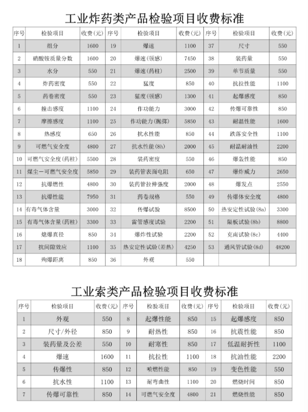 检测检验收费标准按现行自律性收费标准中相应检验项目要求执行,各检验项目单项收费标准如下: